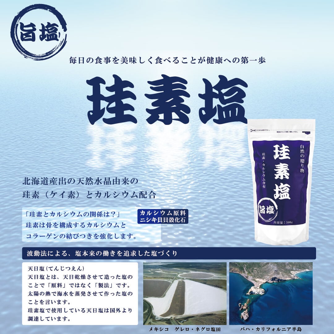 《珪素塩》は北海道産出の天然水晶由来の 珪素とカルシウムを配合しております。にがりが少なく粒子の細かい天日塩です。カルシウムはニシキ貝貝殻化石を使用。塩本来の働きを追求し、こだわりぬいて作ったお塩です。